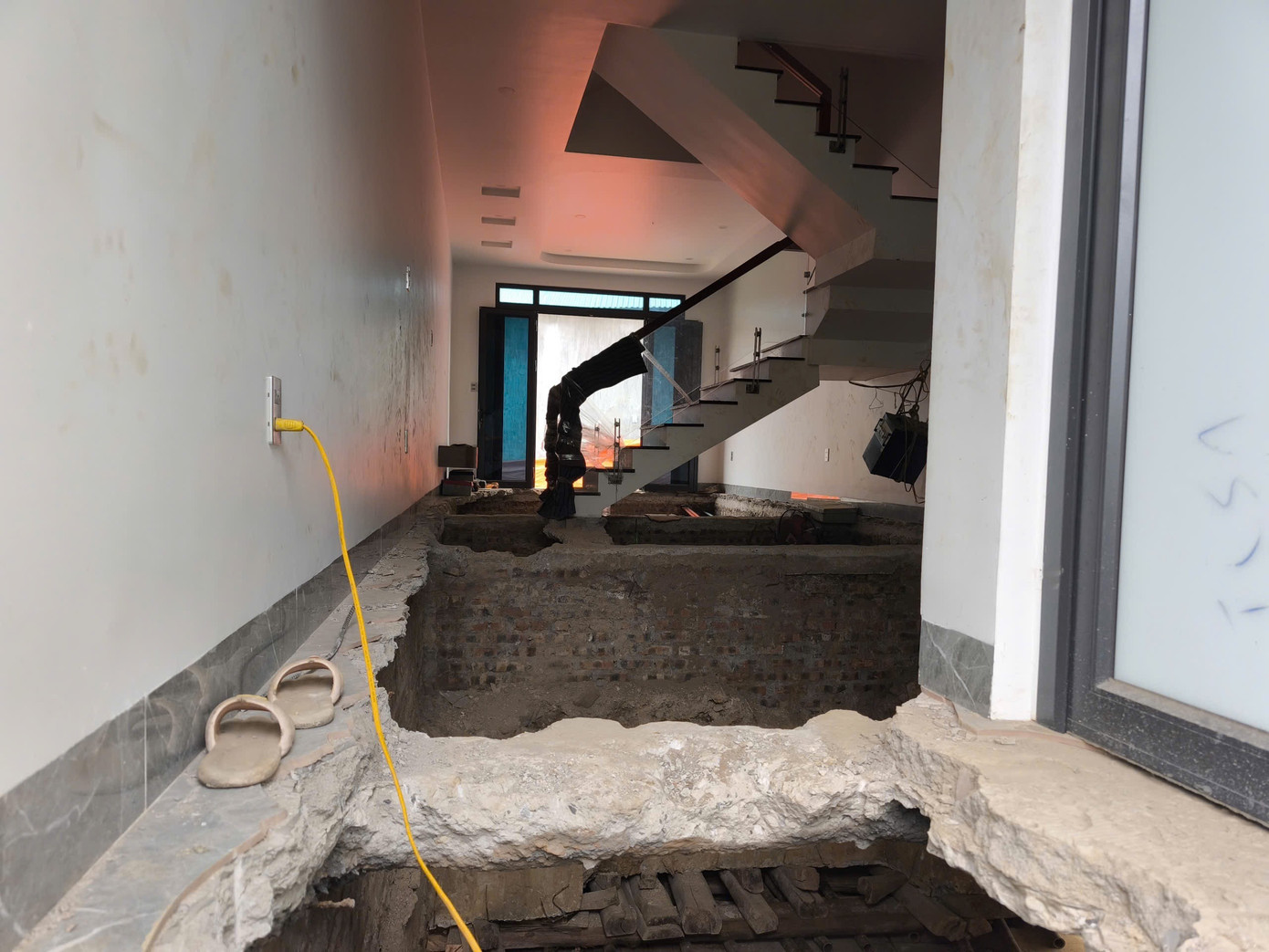 Nhóm thợ đã mất 18 ngày đào sâu 3m đất, nâng toàn bộ ngôi nhà 2 tầng lên cao, đồng thời cắt phần sàn nhà, sân trước và một phần phía sau để khớp với kích thước lô đất của ông Hữu.