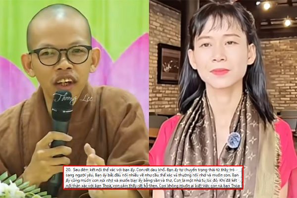 20. Sau đêm kết nối thể xác với bạn ấy. Con rất đau khổ. Bạn ấy tự chuyển trạng thái từ thầy trò sang người yêu. Bạn ấy bắt đầu nói nhiều về nhu cầu thể xác và thường nói nhớ và muốn con. Bạn ấy cũng muốn con nói nhớ và muốn bạn ấy bằng văn và thơ. Con là một nhà tu lúc đó. Khi đã kết nối thân xác với bạn Thoa, con cảm thấy rất hỗ thẹn. Con không muốn ai biết việc con và bạn Thoa có quan hệ thể xác. Nghĩ đến việc những người quý mến con sẽ buồn và những người mến Đạo tổn thương, con càng thêm đau lòng. Nên con buộc phải nói chuyện và nhắn tin theo mong muốn của bạn Thoa để được yên ổn.