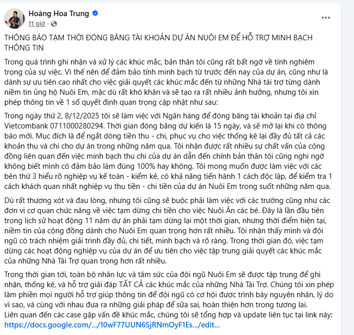 Vào tối 7/12, ông Hoàng Hoa Trung, người sáng lập và điều hành dự án “Nuôi Em”, thông báo sẽ tạm thời đóng băng tài khoản nhận ủng hộ để phục vụ việc rà soát, minh bạch thu chi của dự án.