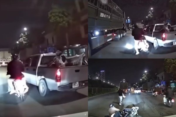 Cú ép xe khiến cả ba người ngã nhào xuống mặt đường. Đáng nói, ngay bên trái là một xe tải đang di chuyển, phía sau cũng có  ô tô con đi tới. Rất may, các phương tiện này đã kịp thời xử lý, không va trúng ba người vừa ngã, tránh được hậu quả nghiêm trọng hơn.