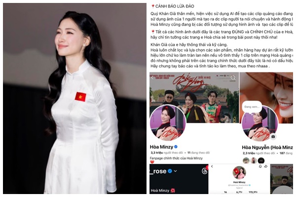 Mới đây, trên trang fanpage của mình, Hòa Minzy đã lên tiếng cảnh báo về tình trạng nhiều đối tượng sử dụng AI để làm giả hình ảnh, lừa dối khán giả. Hoà Minzy nhấn mạnh việc cô luôn lựa chọn các sản phẩm, nhãn hàng uy tín để hợp tác, không quảng cáo tràn lan.