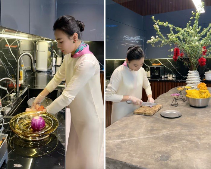 Đáng chú ý, bối cảnh quay chính là trong căn bếp quen thuộc. Cũng trong căn bếp nhà Phương Oanh, không khí đón Tết Nguyên đán đã xuất hiện. Cô trang hoàng nhà cửa bằng bình hoa tiểu tú cầu, gắn những chiếc lồng đèn giấy hot trend Tết 2026.