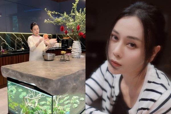 Đáng chú ý, bối cảnh quay chính là trong căn bếp quen thuộc. Cũng trong căn bếp nhà Phương Oanh, không khí đón Tết Nguyên đán đã xuất hiện. Cô trang hoàng nhà cửa bằng bình hoa tiểu tú cầu, gắn những chiếc lồng đèn giấy hot trend Tết 2026.