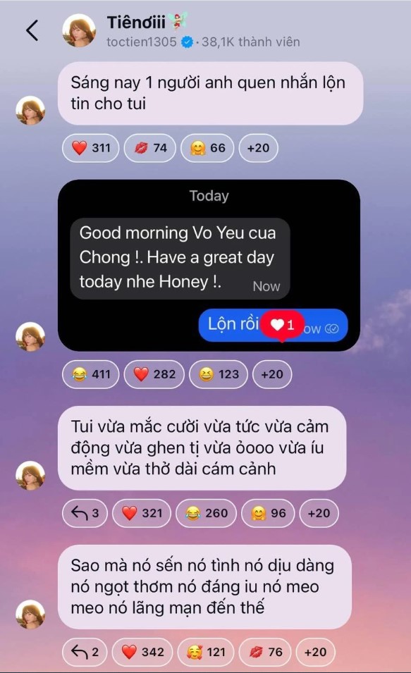 Tuy nhiên, trước khi để khán giả kịp đẩy con thuyền đi quá xa, Tóc Tiên đã nhanh chóng lên tiếng giải thích về tình huống oái oăm này. Hóa ra, đây chỉ là một tin nhắn gửi nhầm số từ một người anh quen biết của nữ ca sĩ dành cho vợ mình. Tóc Tiên bày tỏ sự ngưỡng mộ xen lẫn ghen tị trước tình cảm mặn nồng của cặp đôi U60: “Tôi vừa mắc cười, vừa tức vừa cảm động. Sao mà nó sến, nó tình và lãng mạn đến thế”. Dù cảm thấy dễ thương, nhưng với tính cách thẳng thắn và hài hước, nữ ca sĩ không quên “dằn mặt” rằng nếu còn bị nhắn lộn lần nữa, cô sẽ thẳng tay “block” người anh này để bảo toàn năng lượng tích cực cho bản thân.