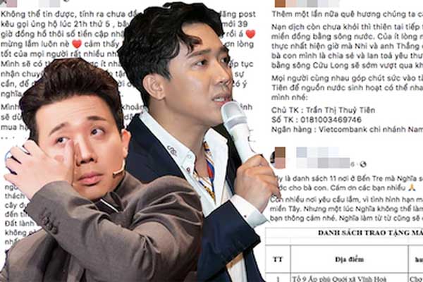 Trấn Thành cũng lên tiếng kêu gọi khán giả chung tay ủng hộ đồng bào chịu ảnh hưởng nặng nề của thiên tai. “Chúng ta mỗi người giúp một tay. Người dân miền Trung rất cần chúng ta ngay lúc này. Cầu mong cho tai qua nạn khỏi, bà con sớm bình an. Trấn Thành xung phong trước 500 triệu. Mỗi người một ít nhé”, anh viết.