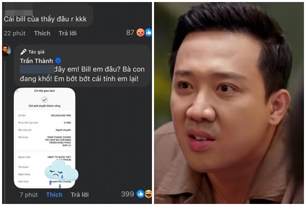 Dưới bài viết này, bên cạnh những bình luận hưởng ứng hành động đẹp, ấm lòng của Trấn Thành, thì 1 bình luận gây sự chú ý khi đòi Trấn Thành “show bill”: Cái bill của thầy đâu rồi ạ”, người này bình luận. Ngay lập tức, Trấn Thành liền đáp trả bằng hình ảnh 1 chiếc bill chuyển khoản 500 triệu đồng tới UBMT Tổ quốc Việt Nam TP.HCM kèm dòng bình luận: “Đây em, bill của em đâu. Bà con đang khổ, em bớt bớt cái tính em lại”. Bình luận này của ông xã Hari Won đã nhận về hàng nghìn lượt thích.