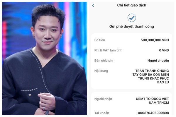 Trưa 23/11, trên trang fanpage hơn 18 triệu người theo dõi, Trấn Thành thông báo đã gửi 500 triệu đồng tới Ủy ban Mặt trận Tổ quốc Việt Nam TP.HCM để hỗ trợ người dân miền Trung đang oằn mình vì mưa lũ. Nam nghệ sĩ cho biết anh muốn đóng góp ngay lập tức và mong khán giả cùng chung tay giúp đồng bào vượt qua giai đoạn khó khăn này.