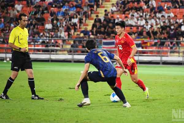 Cầu thủ mang áo số 10 xử lý bóng khéo léo trước khi tung ra một cú dứt điểm. Thủ thành U22 Thái Lan không thể bắt gọn, và Thanh Nhàn lao vào đá bồi ghi bàn nâng tỉ số lên 3-2.