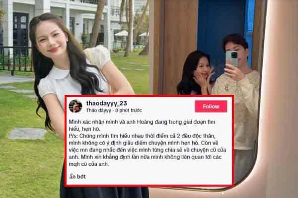 “Mình xác nhận mình và anh Hoàng đang trong giai đoạn tìm hiểu, hẹn hò. Chúng mình tìm hiểu nhau thời điểm cả 2 đều độc thân, mình không có ý định giấu diếm chuyện mình hẹn hò. Còn về việc mọi người đang nhắc đến việc mình từng chia sẻ về chuyện cũ của anh. Mình xin khẳng định lần nữa mình không liên quan tới các mối quan hệ cũ của anh”, Thảo Đây viết trên trang cá nhân.