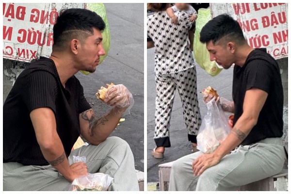 Quang nhìn vào bức hình, thấy một bản thân rất khác – không sân khấu, không ánh đèn, không chỉnh chu. Chỉ là một người đàn ông ngồi ăn vội ổ bánh mì bên lề đường, lặng lẽ giữa dòng đời. Một bữa ăn đơn giản mà ngon, vì đúng lúc đó, Quang cần nó để tiếp tục… làm việc, suy nghĩ, tồn tại.