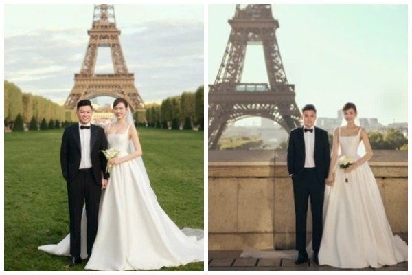 Bộ ảnh này được cặp đôi chụp tại Pháp, cô dâu diện váy cưới đơn giản nhưng sang trọng, khoe đôi “kiếm nhật” 1,11m. Chú rể Viết Vương giữ vững phong độ điển trai, anh phối hợp tạo dáng rất chuyên nghiệp cùng vợ. Đáng nói, cư dân mạng liên tục “soi” ra nam thiếu gia có thói quen hôn vào cổ vợ, đây cũng là hành động “đặc trưng” của cặp đôi liên tục bị bắt gặp trong đám cưới.