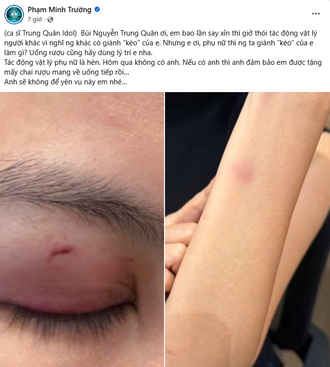 Trước đó, mạng xã hội xuất hiện bài đăng từ tài khoản được cho là chồng của người phụ nữ bị “tác động vật lý”. Trong bài viết, người này cho biết sự việc bắt nguồn từ một hiểu lầm trong lúc tụ tập, xoay quanh chuyện “giành kèo” khi giao lưu giữa nhóm bạn. Thời điểm xảy ra tranh cãi, nam ca sĩ bị cho là đã sử dụng rượu bia nên không còn giữ được sự tỉnh táo.