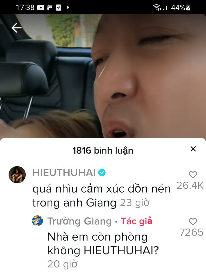 Ngay sau đó, nam rapper cũng đã để lại bình luận dưới clip đàn anh: “Quá nhìu cảm xúc dồn nén trong anh Giang”. Phía Trường Giang cũng có những tương tác thú vị dành cho người em thân thiết: “Nhà em còn phòng không HIEUTHUHAI?”. Loạt bình luận thú vị giữa Trường Giang và HIEUTHUHAI nhận “bão tim”