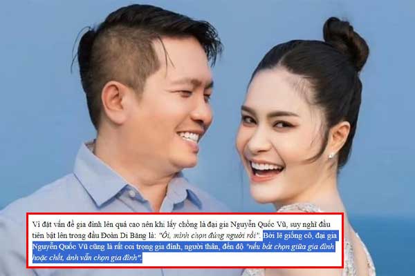 Với cô, vấn đề gia đình rất quan trọng. Cô tiếp tục khẳng định việc lấy doanh nhân Nguyễn Quốc Vũ là điều đúng đắn, bởi theo cô người đàn ông này rất trọng gia đình. Đoàn Di Băng đặt giả thuyết về chồng mình: “Nếu bắt chọn gia đình thì phải chết, anh ấy vẫn chọn gia đình”.