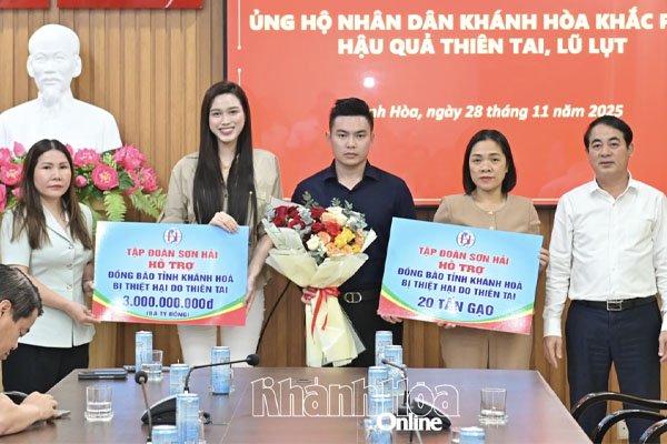 Trước đó, vào chiều 28/11, Tỉnh ủy Khánh Hòa tổ chức tiếp nhật 3 tỷ đồng, 20 tấn gạo từ Tập đoàn Sơn Hải để giúp đỡ bà con bị ảnh hưởng do thiên tai. Trong buổi lễ này, Hoa hậu Đỗ Hà cũng ăn diện giản dị, thân thiện cùng chồng làm thiện nguyện.