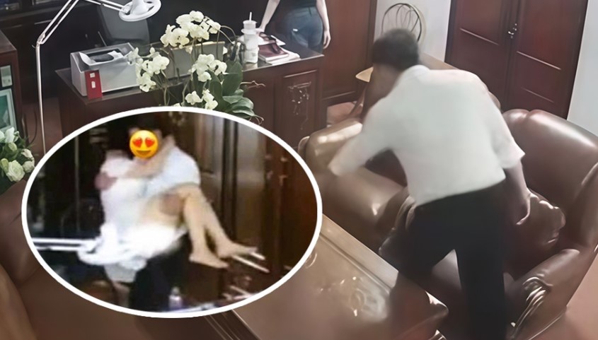 Hình ảnh người đàn ông thân mật với nhiều người phụ nữ trong phòng làm việc.