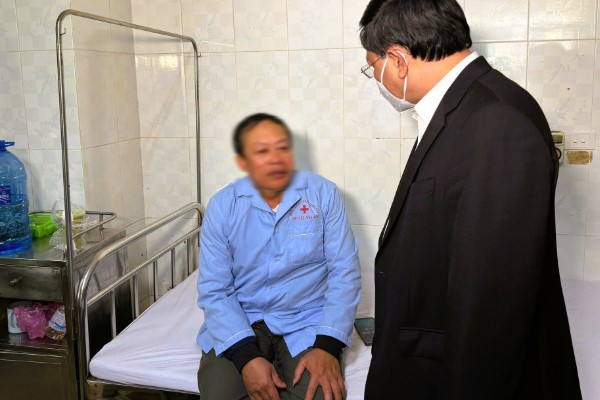 Ông Mai Xuân Liêm, Phó Chủ tịch Thường trực UBND tỉnh Thanh Hóa ,thăm hỏi một người bị thương trong vụ tai nạn tại Bệnh viện Đa khoa tỉnh Thanh Hóa