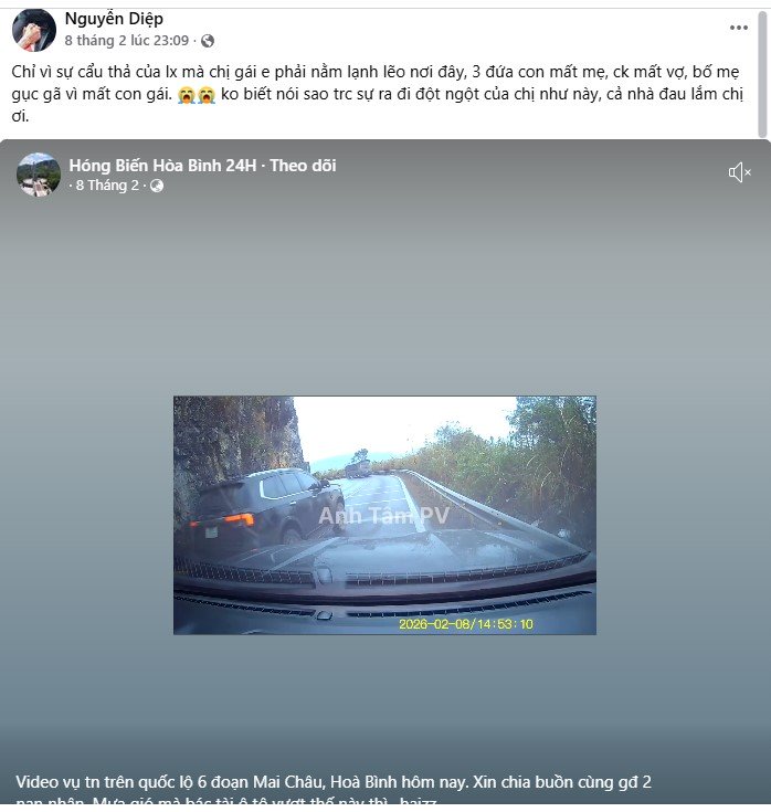 Cụ thể, vào khoảng 14h52 phút ngày 8/2 tại km128+ 350 Ql6, thuộc địa phận xóm Đậu, xã Mai Châu, tỉnh Phú Thọ xảy ra vụ tai nạn giao thông đường bộ giữa xe ôtô biển kiểm soát 15C- 461.xx do anh Nguyễn Bá T., sinh năm 1981, trú tại tổ 6, phường Trần Thành Ngọ, thành phố Hải Phòng lưu thông hướng Sơn La – Hà Nội điều khiển.