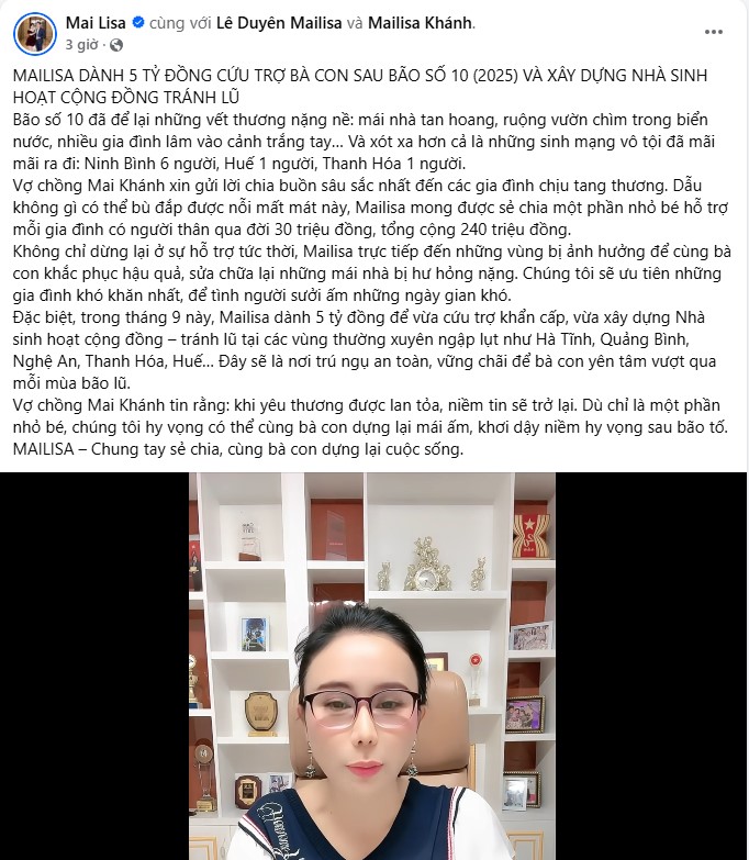 Tháng 9 này, Mailisa dự kiến sẽ dành 5 tỷ đồng vừa để cứu nguy khẩn cấp sau cơn bão số 10 trong năm 2025, vừa để xây dựng những Nhà sinh hoạt cộng đồng tránh lũ, góp phần cùng bà con vững vàng trước thiên tai. Vợ chồng Mai – Khánh tin rằng, trong gian khó, tình người chính là sức mạnh để vượt qua bão tố. Mailisa mong được góp một phần nhỏ bé, để cùng bà con dựng lại cuộc sống, thắp sáng niềm tin và hy vọng”, nữ doanh nhân viết.