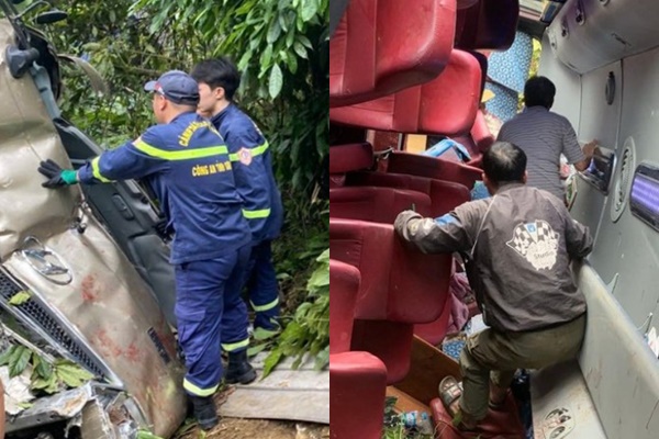Ô tô khách bị hư hỏng nặng sau cú rơi từ độ cao 100m.
