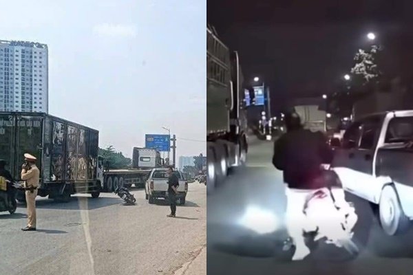 Trước đó, trên mạng xã hội xuất hiện đoạn clip ghi lại cảnh ô tô bán tải màu ghi xám (chưa rõ biển kiểm soát) đang lưu thông thì bất ngờ tạt đầu xe máy trên đường Vành đai 3 (Hà Nội).