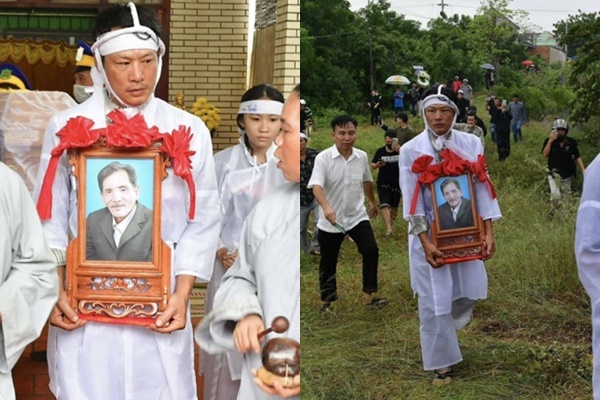 Thanh Tùng, con trai Thương Tín, ôm di ảnh cha còn con gái 12 tuổi của cố diễn viên, chống gậy dẫn đầu đoàn người tiễn đưa ông về nơi an nghỉ, chiều 10/12.