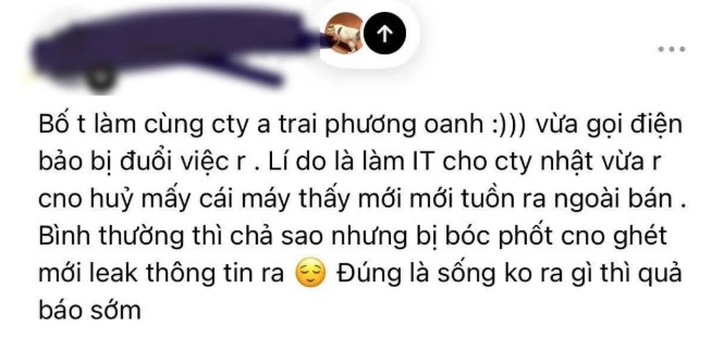 Chưa dừng lại ở đó, bên dưới phần bình luận, một tài khoản khác tiếp tục khẳng định thông tin em trai Phương Oanh bị mất việc là có thật và cho rằng người đứng ra tố giác không ai khác chính là vợ cũ của anh. Dù những thông tin này hoàn toàn chưa được người trong cuộc xác nhận hay lên tiếng đính chính, bài đăng vẫn nhanh chóng thu hút hơn 10.000 lượt tương tác cùng hàng trăm bình luận trái chiều, đẩy sự việc đi xa ngoài tầm kiểm soát.